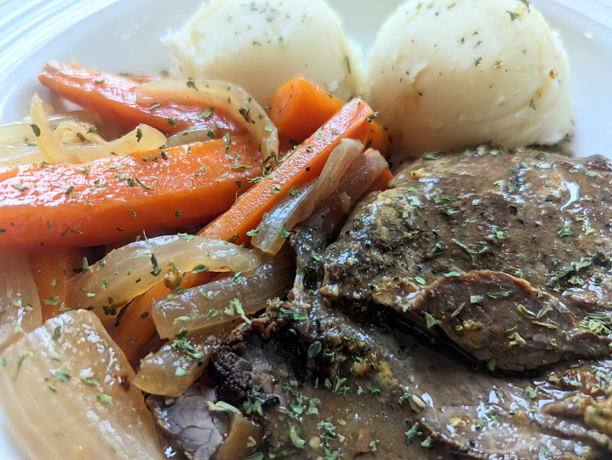 Servi avec carottes, choux de Bruxelles et pommes de terre pilées.