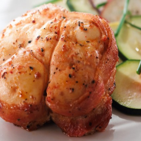 Tournedos (poulet assaisonné (poulet, eau, sel), bacon (porc, eau, sucres (sucre, cassonade), sel, chlorure de potassium, phosphate de sodium, saveur, érythorbate de sodium, nitrite de sodium, épices, fumée)), Sauce méditerranéenne (eau, assaisonnement méditerranéen, huile de canola, sucre, sel, vinaigre blanc, graine de moutarde,épices)